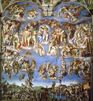 Moment sądu ostatecznego przedstawił Michał Anioł Buonarroti na wspaniałym fresku, znajdującym się w Rzymie, na ścianie ołtarzowej kaplicy Sykstyńskiej. Fresk zajmuje całą ścianę, a ma ona 18 metrów szerokości i 20 metrów wysokości. Obraz przedstawia Sąd Ostateczny, gdy na dźwięk trąb archanielskich umarli powstają z grobów (dół obrazu — ziemia) i wznoszą się do nieba (lewa strona obrazu — przestworza), lub wtrącani są do piekła (prawa strona obrazu). W górze, ponad obłokami znajduje się Chrystus i Najświętsza Panna w otoczeniu apostołów i świętych. Aniołowie (artysta przedstawił ich bez skrzydeł) znajdują się wszędzie: utrzymują porządek i wykonują rozkazy Boże. Oni to u samej góry obrazu unoszą krzyż męki Pańskiej i kolumnę biczowania jako pobudki wyrzutów sumienia dla powstałych na sąd. Oni pomagają sprawiedliwym wejść do nieba, a nie dopuszczają tam potępionych.
