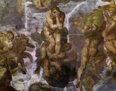 Znakomicie wyraża tę myśl twarz jednego z potępionych, (strona prawa, pod postacią św. Piotra), zwrócona wprost do widzów. Potępieniec wsparł twarz na dłoni, którą obejmuje swój podbródek i lewy policzek, cały ciężar głowy spoczywa na łokciu. Ciemne, kędzierzawe włosy okalają młodą twarz. Oko wielkie, czarne, szeroko otwarte patrzy przed siebie w nieskończoną dal. Wzrok ten skamieniały, szklany, beznadziejny najmocniej przemawia do duszy widza, który mógłby odczytać myśli nieszczęśliwego potępieńca: Więc już nic mi nie pomoże, ani teraz, ani w przyszłości, ani w wieczności, z piekieł bowiem nie ma wyjścia! Artysta znakomicie odtworzył w postaciach potępionych beznadziejność ich losu. Do nich przecież odnosi się sprawiedliwy i nie odmienny wyrok Boży: „Pójdźcie potępieni w ogień wieczny!”